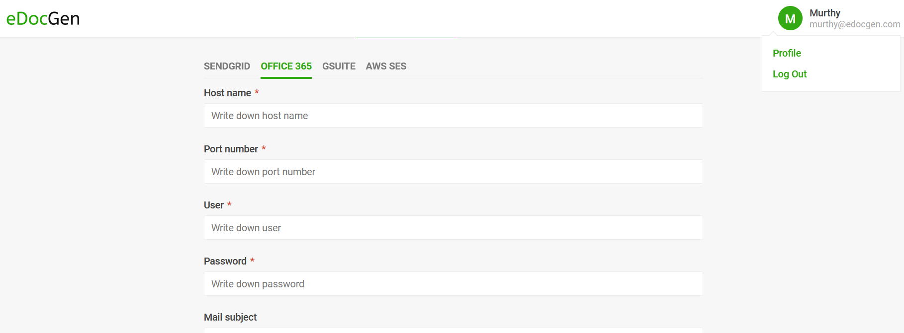 EDocGen has integrations with Office 365, GSuite, SendGrid, etc. Thus, you can send generated documents from your business email. You need to configure your business email in the system, before using it.